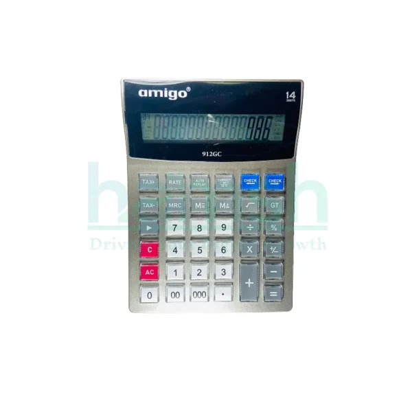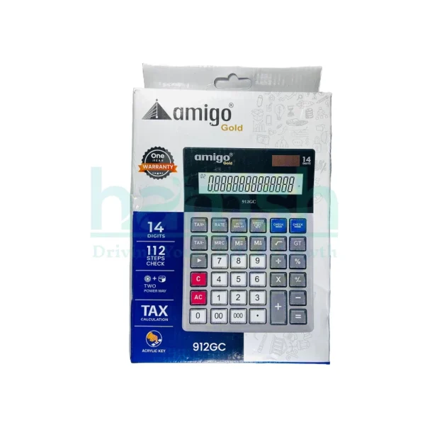 The Amigo Gold 912GC Calculator offers a large 14-digit LCD display, ideal for professionals who need accuracy and efficiency in their work. With a sleek gold finish and robust build, this calculator is perfect for accounting, finance, and business environments.