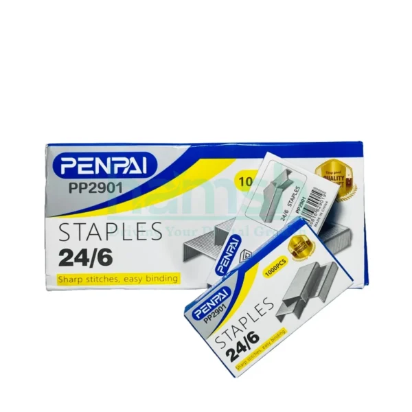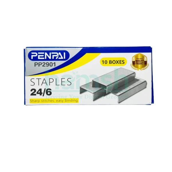 The Penpai Staple Pins 24/6 pack contains 10 boxes, each with 1000 staples, totaling 10,000 staples. Designed to fit most standard 24/6 staplers, these high-quality metal pins provide strong and consistent fastening for office, school, and home use.