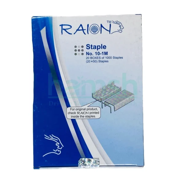 The Raion Staple Pins 10-1M pack contains 20 boxes, each with 1000 staples, totaling 20,000 staples. These staples are perfect for use with heavy-duty staplers, providing firm and consistent binding for thick stacks of paper and materials.